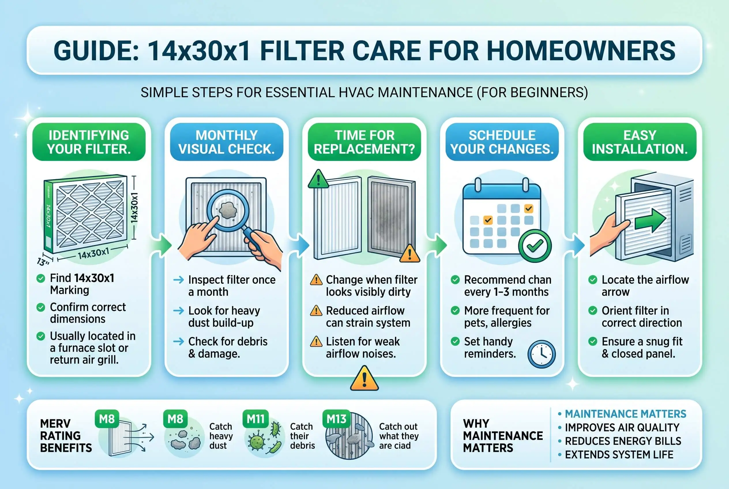 Here's the good news: caring for a 14x30x1 is simpler than the dusty filter makes it look. The steps below come from more than a decade of manufacturing air filters and serving over two million households, written for the homeowner doing this for the very first time. Three things sit on the line every time you change this filter: airflow through your vents, efficiency on your utility bill, and the air your family actually breathes.